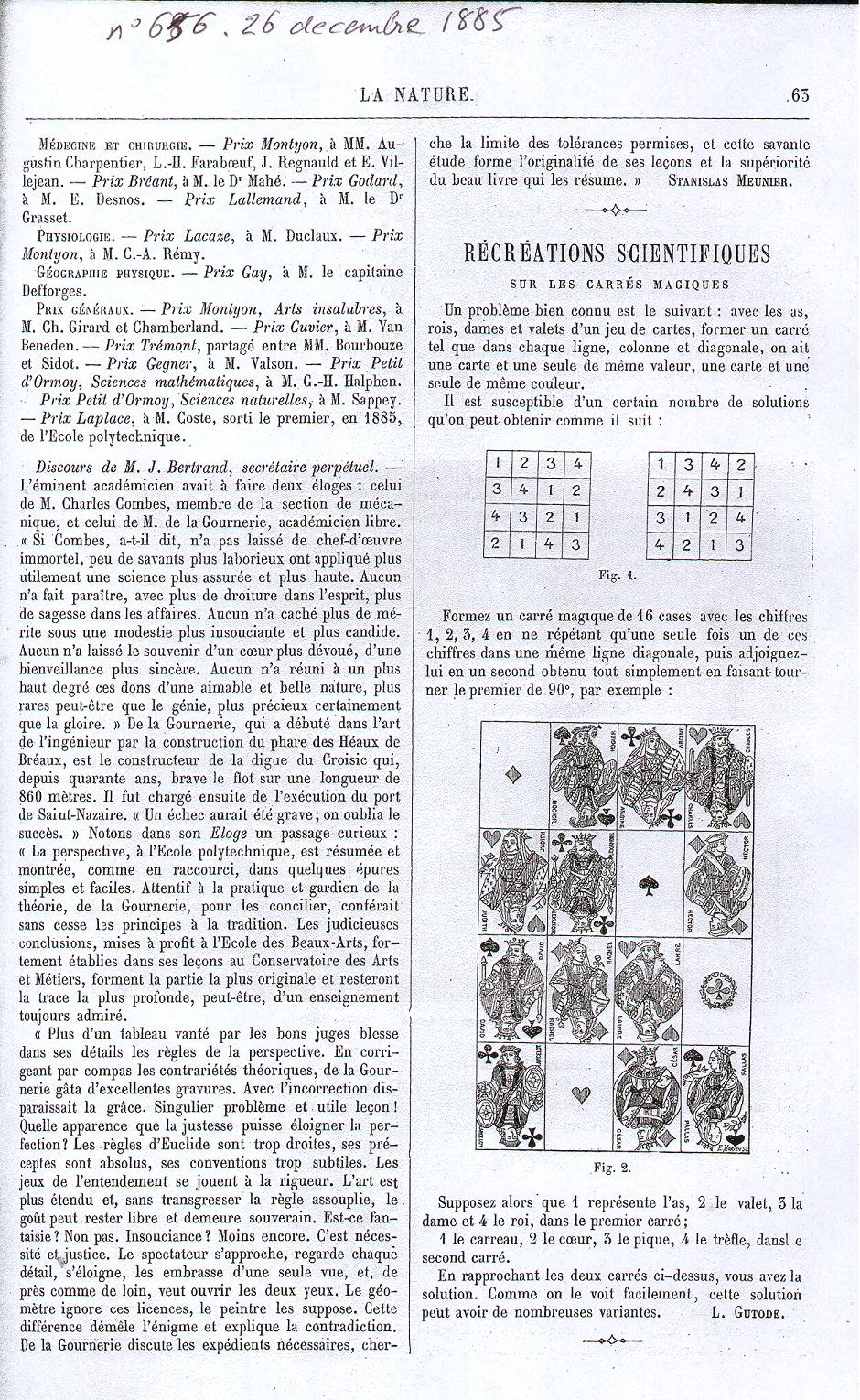 Further to the article Sudoku's French ancestors (Pour La Science, n°344, june 2006), I point out an article published in La Nature magazine, December 26 1885. In a 4x4 square, "place the Aces, Kings, Queens, Jacks of a pack of cards with (in each row, column and diagonal) one and only one card of the same value, and one and only one card of the same suit". It has to be compared with the 81 officers problem of the article, because each element has two attributes.